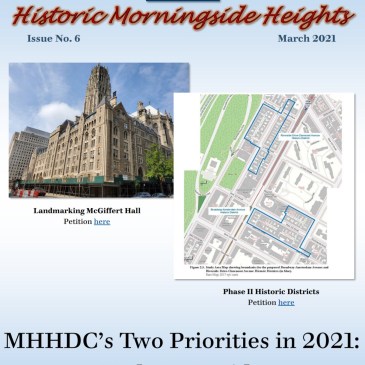 Here’s the March issue of Historic Morningside Heights. We remain focused on seeking Landmark status for McGiffert Hall and on expanding our Historic District protections.