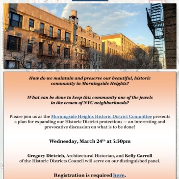 Please join us for a very timely and interesting discussion on what we must do to provide greater protections to our community during this era of real estate overdevelopment. Architectural historian Gregory Dietrich and Kelly Carroll of the Historic Districts Council will lead the conversation and offer their views on the policies and practical realities … More A plan to expand our Historic District Protections in Morningside Heights with Gregory Dietrich and Kelly Carroll